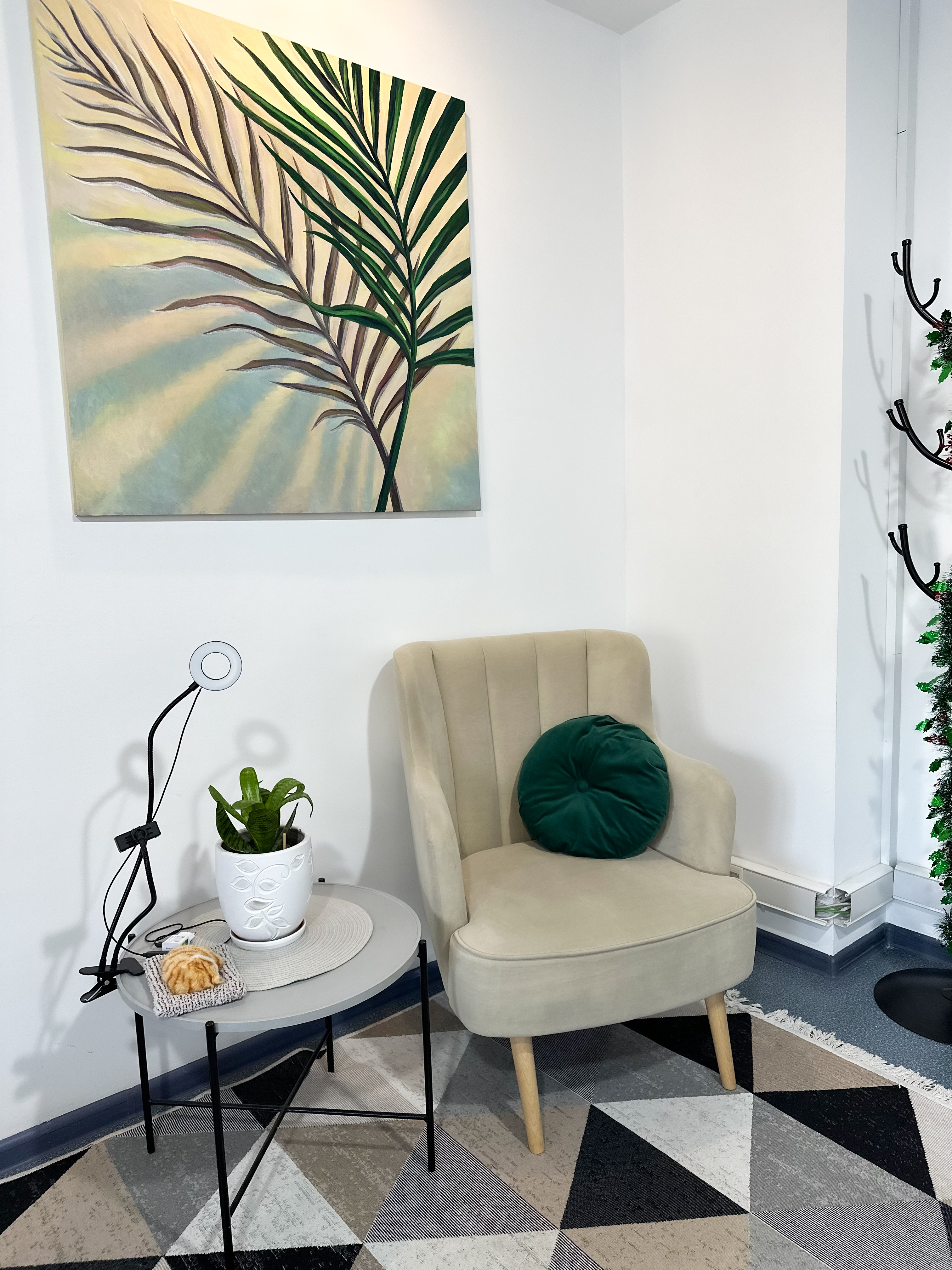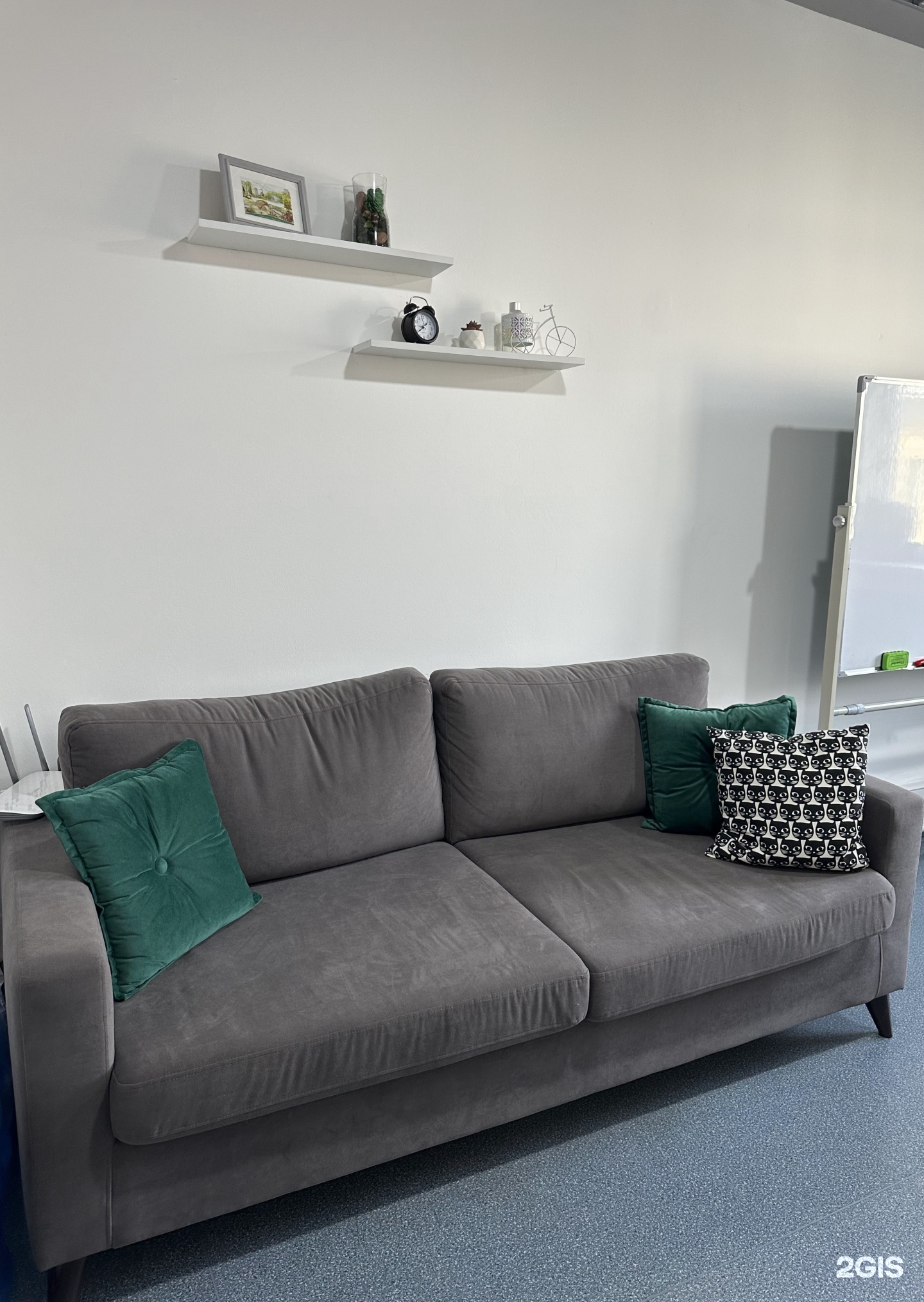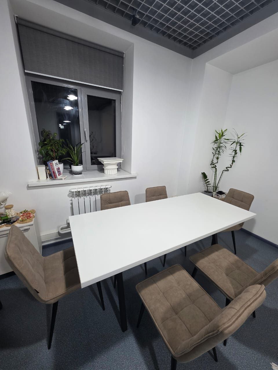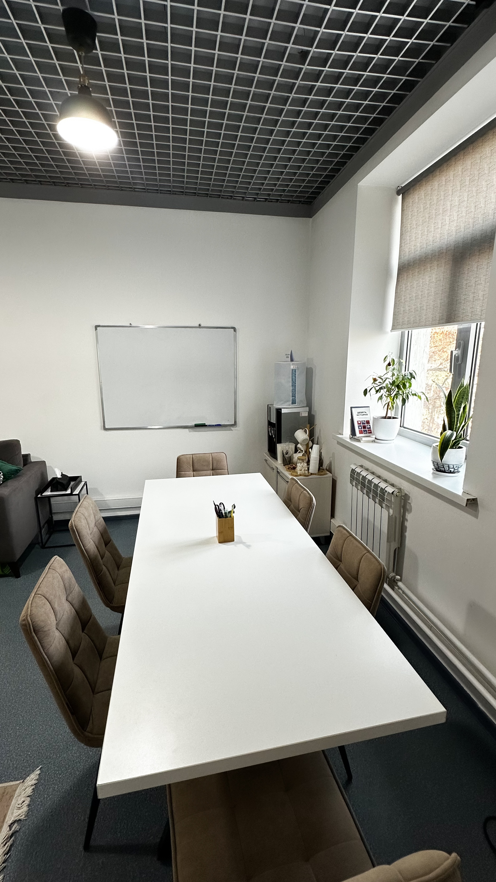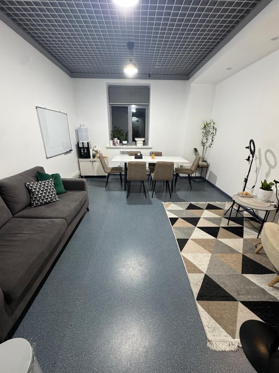 Диван, стол 180x90, 5 стульев, кольцевая лампа, маркерная доска, проектор