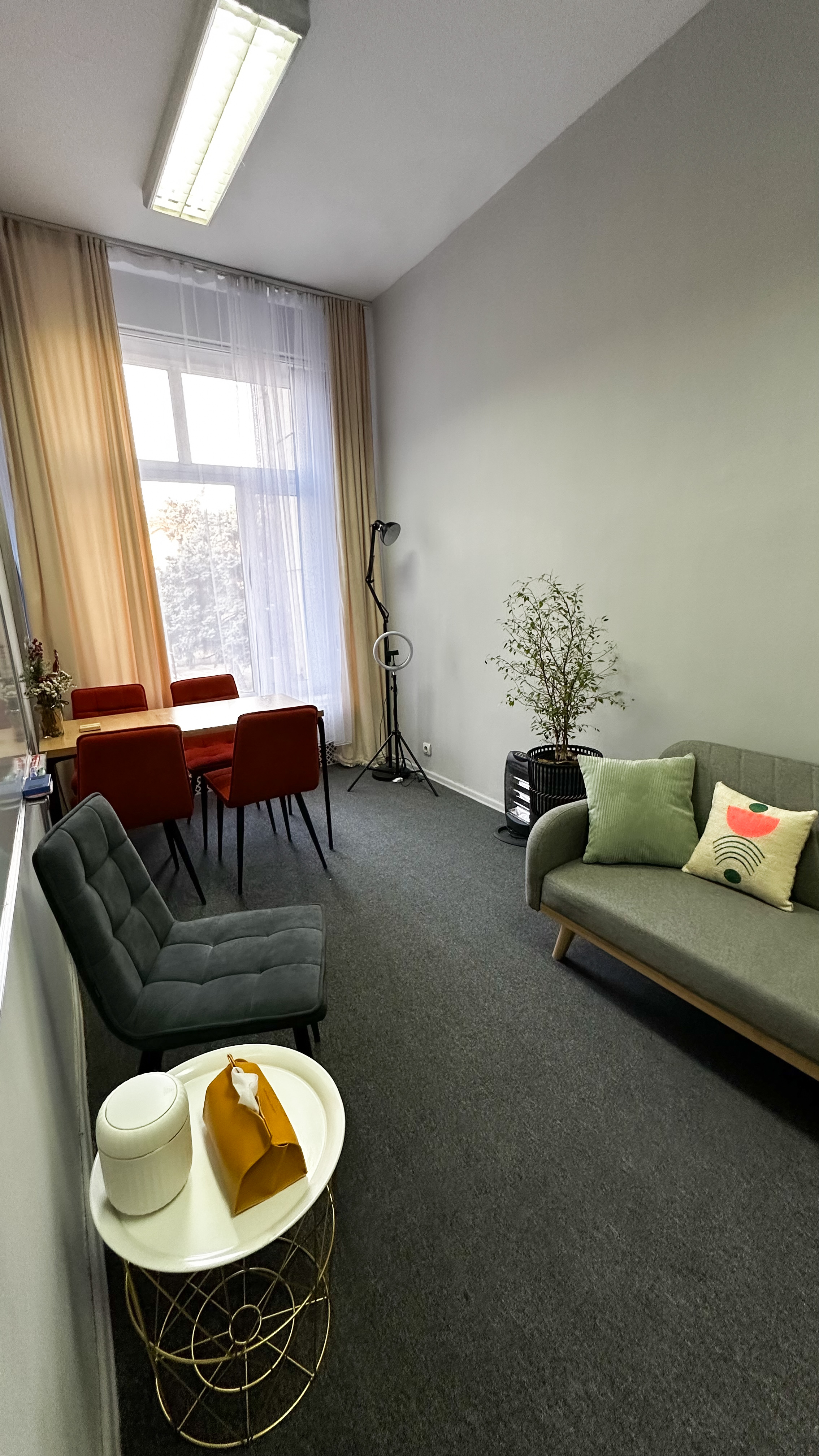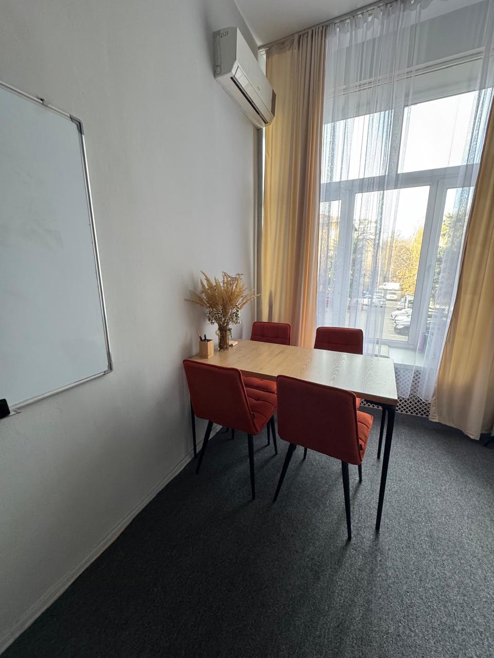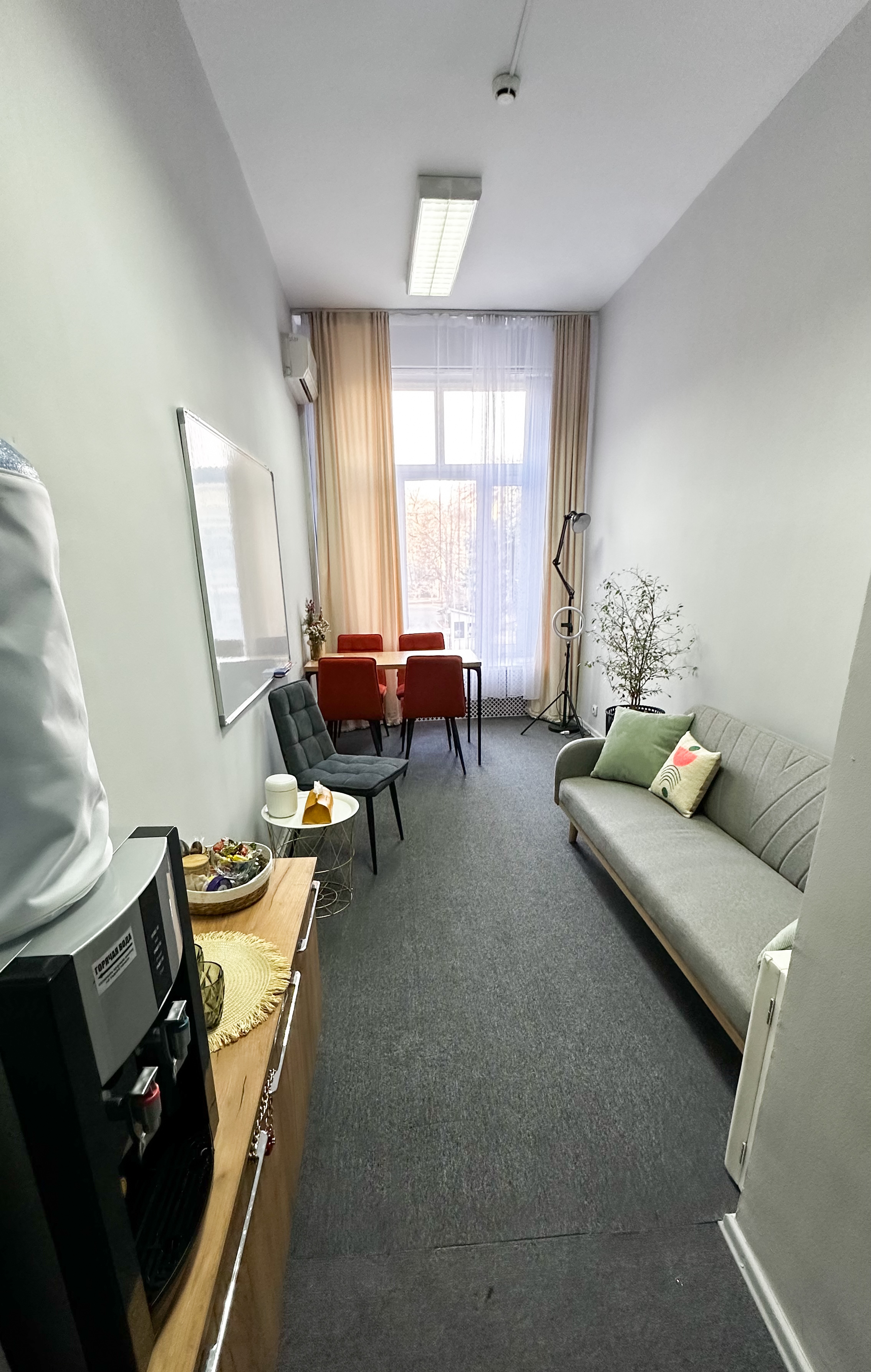 диван, стол, 5 стульев, ковролин, кольцевая лампа, маркерная доска