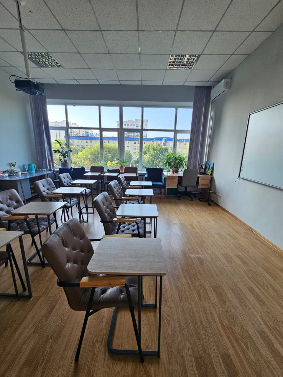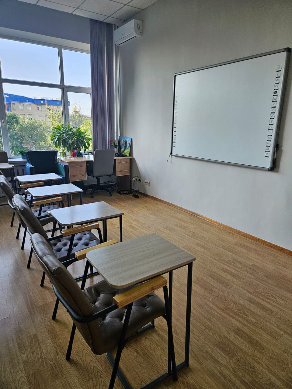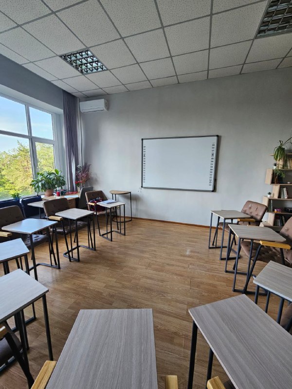 10 столиков, которые можно собрать в 1 большой стол, диван, 2 кресла, 10 стульев, проектор, интерактивная доска, маркерная доска