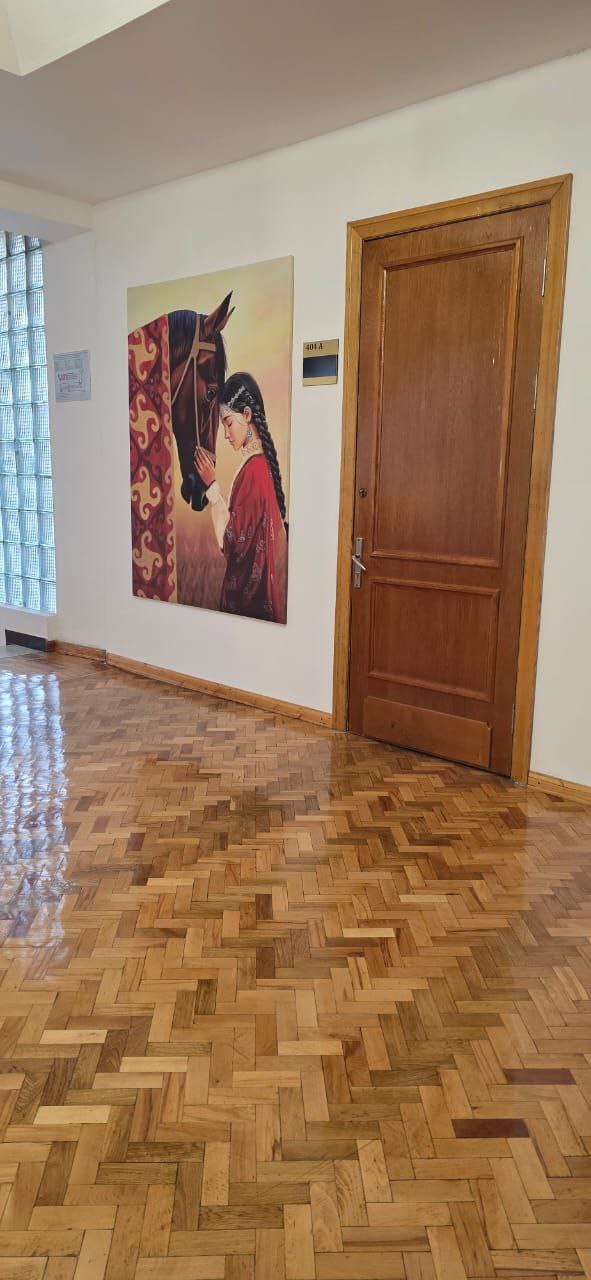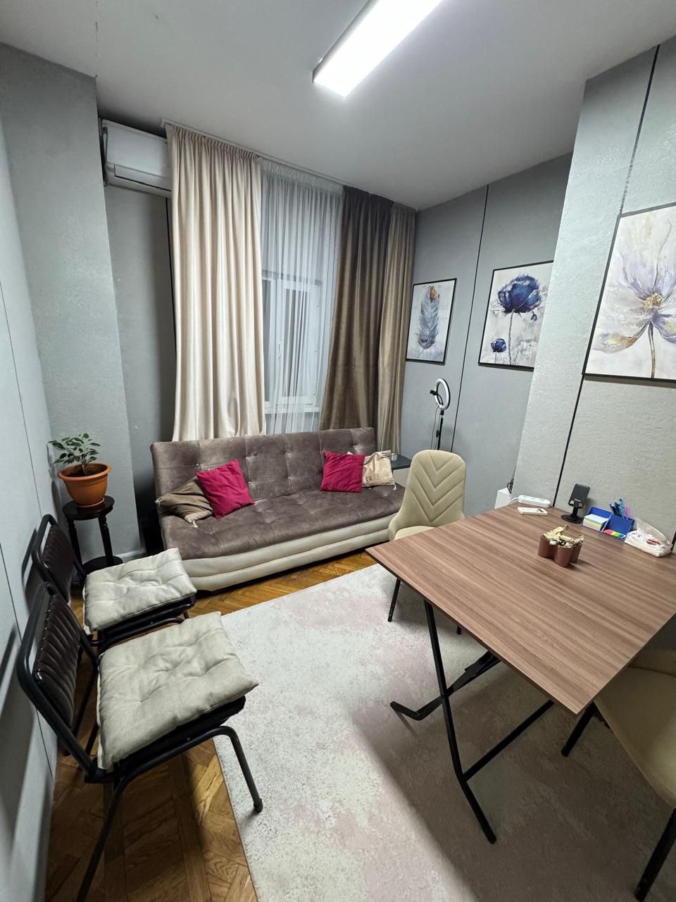 диван, раскладной стол, 4 стула, ковер, кольцевая лампа, маркерная доска