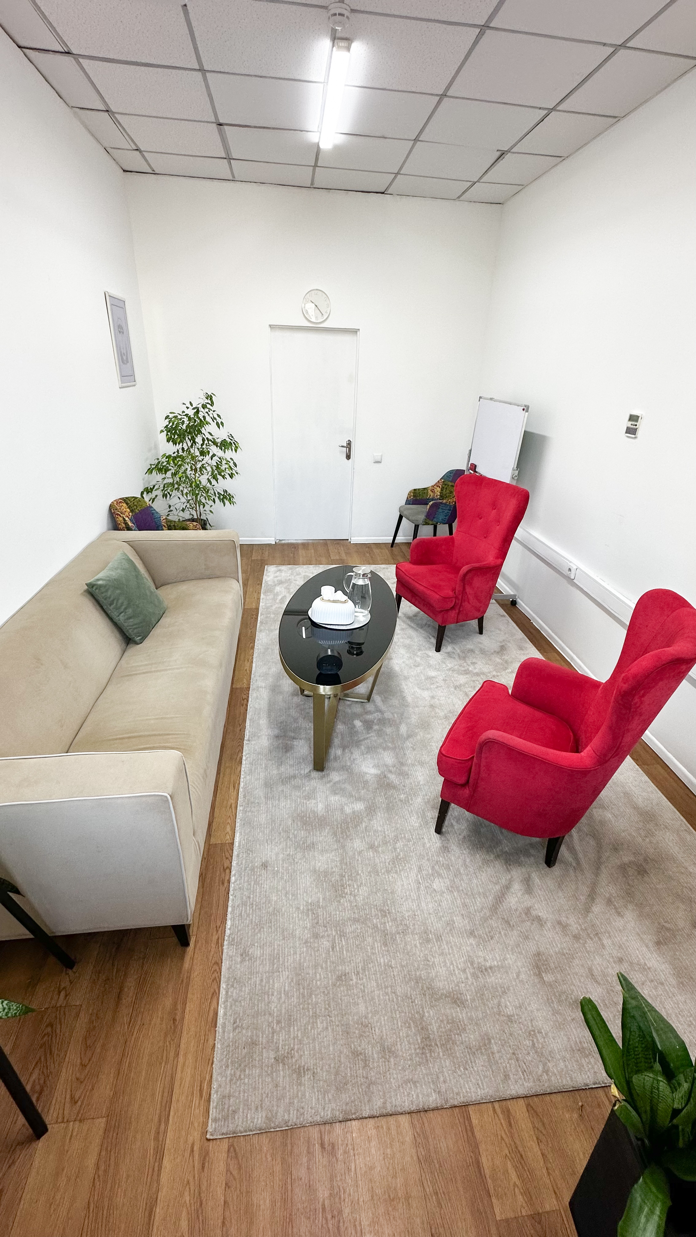 диван, 2 кресла, стулья, маркерная доска, ковер, кушетка раскладная по запросу, проектор по запросу