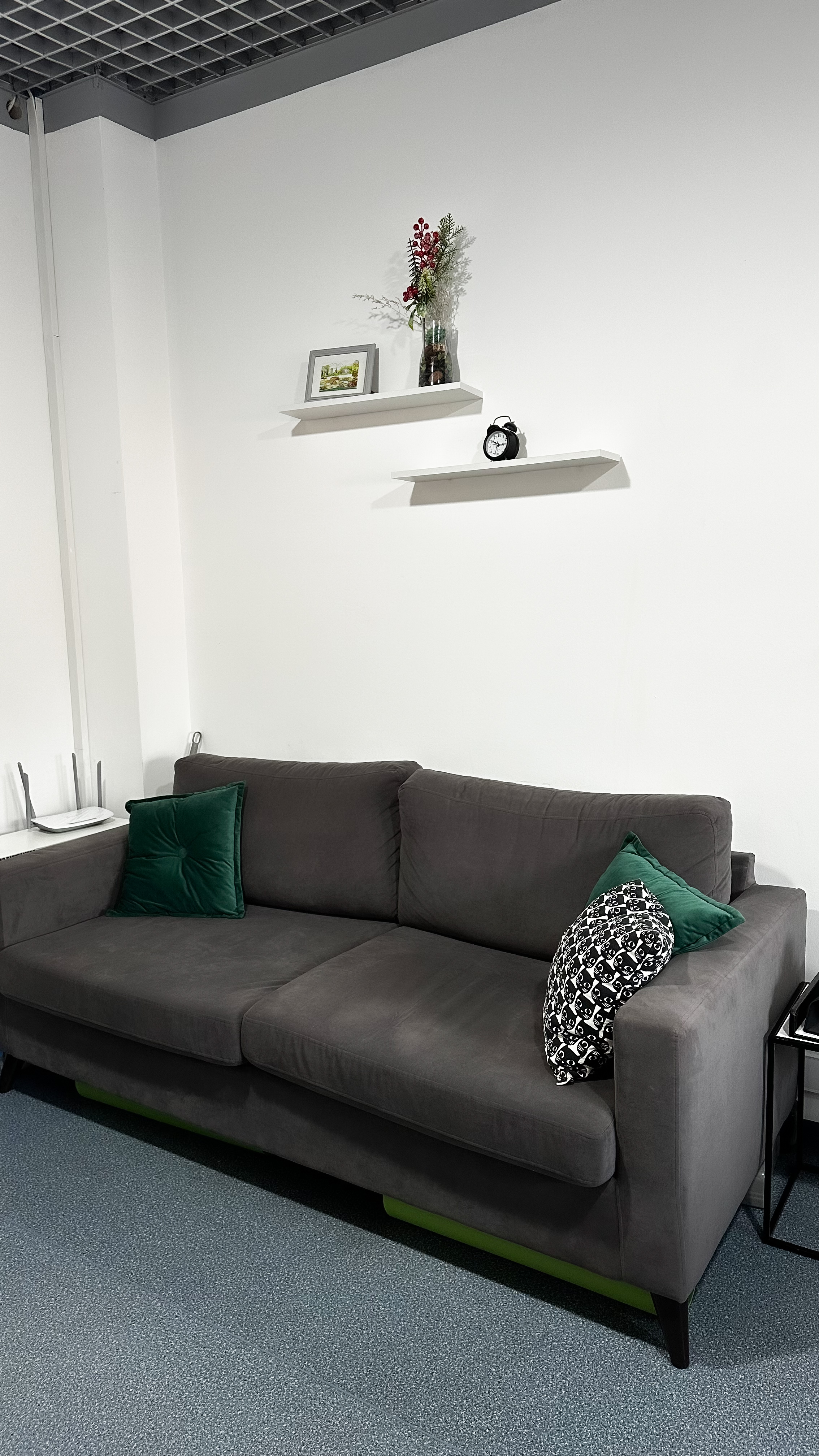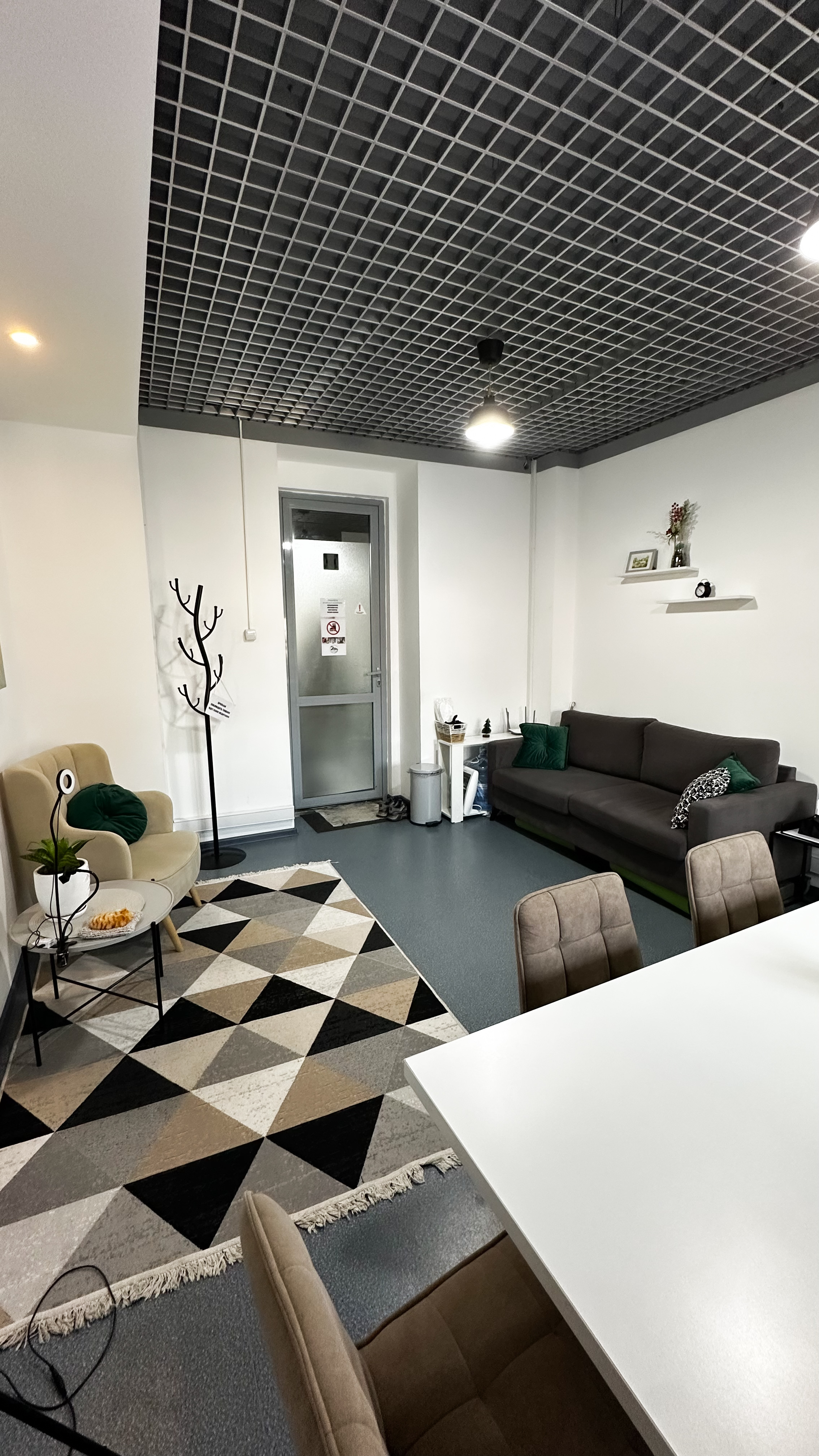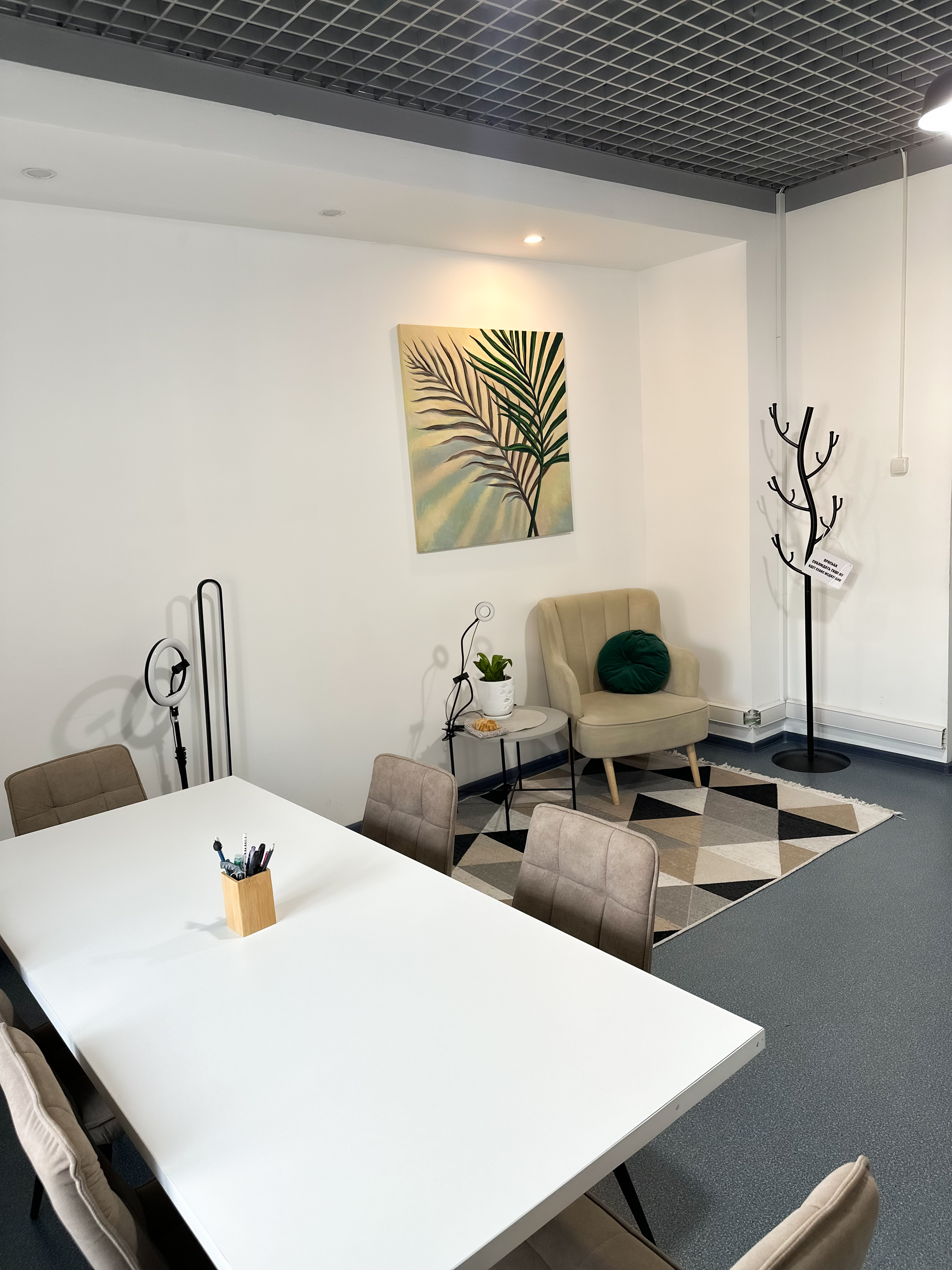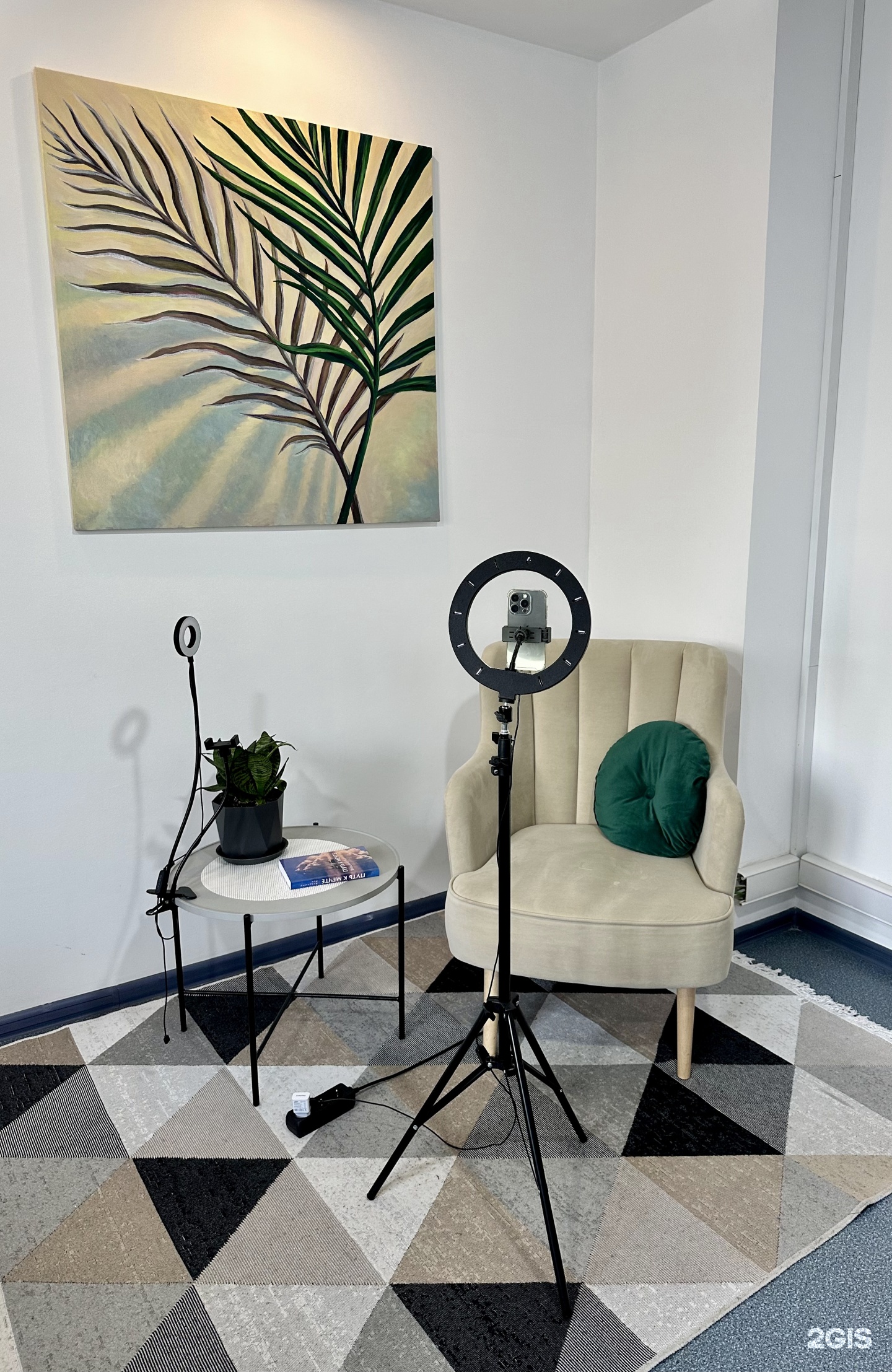 Диван, стол 180x90, 5 стульев, кольцевая лампа, маркерная доска, проектор
