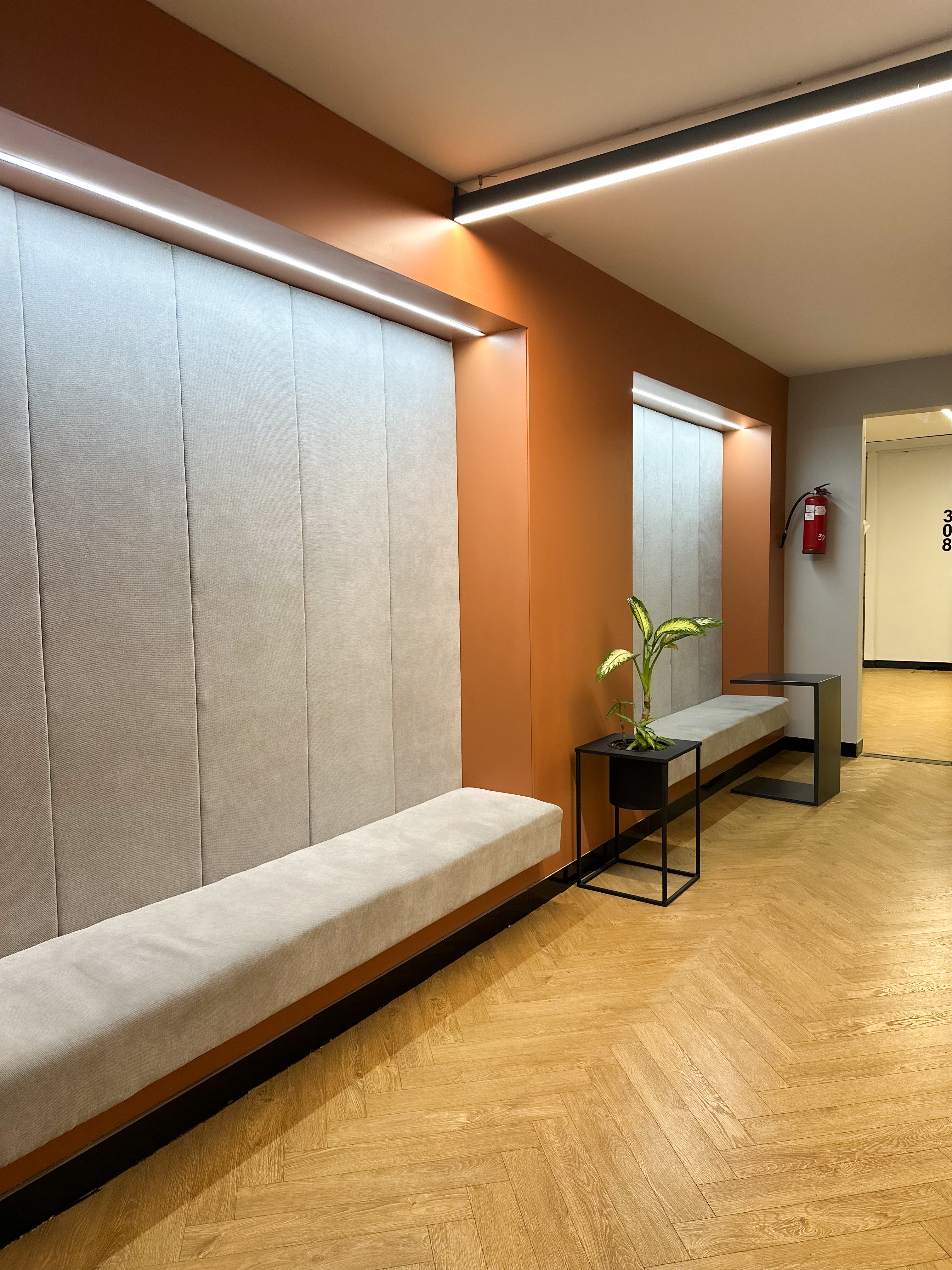 диван, стол, 5 стульев, ковролин, кольцевая лампа, маркерная доска