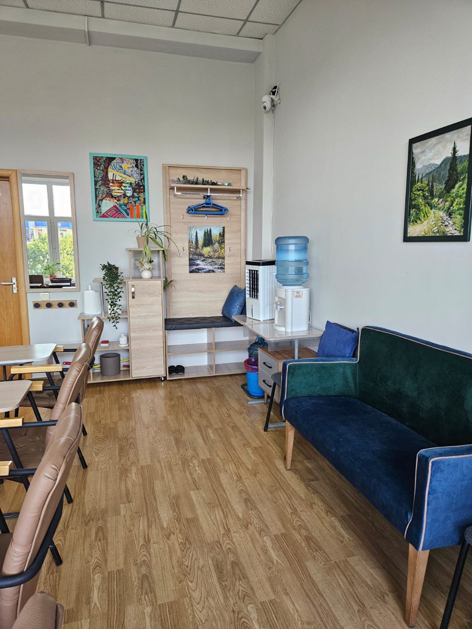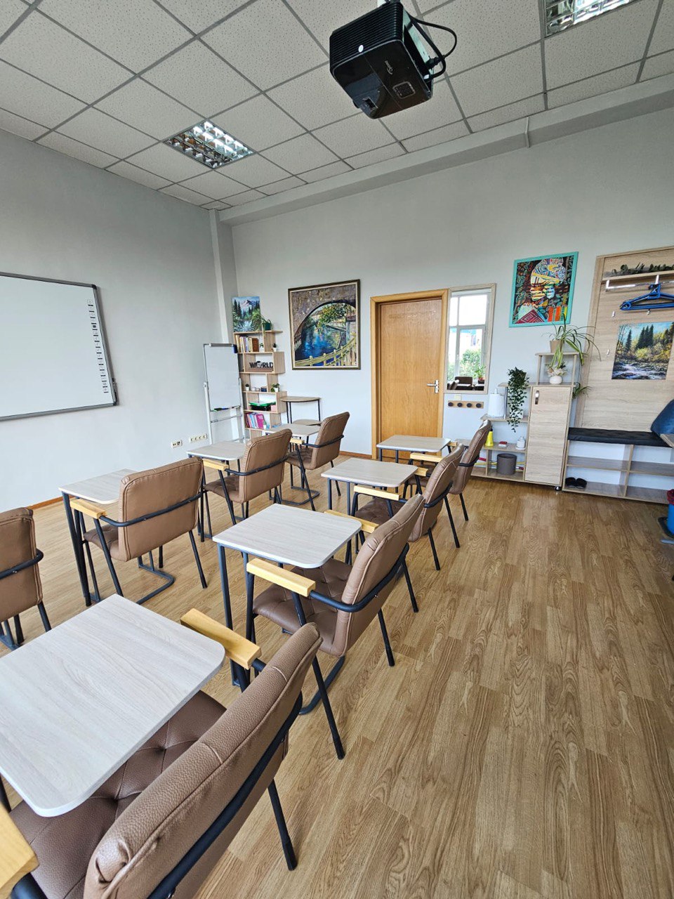 10 столиков, которые можно собрать в 1 большой стол, диван, 2 кресла, 10 стульев, проектор, интерактивная доска, маркерная доска
